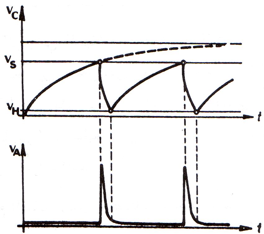 يعتمد الزمن اللازم لشحن المكثف على قيمة المقاومة (R1) وسعة المكثف (C) ، فكلما كانت قيمة المقاومة (R1) كبيرة كلما كان الزمن اللازم حتى يصل فرق الكمون بين طرفي المكثف (C) إلى القيمة (Vs) أكبر ، وكذلك يعتمد زمن التفريغ على قيمة المقاومة (R2) ، فعندما تكون قيمتها صغيرة يكون زمن التفريغ صغيراً .تأخذ إشارة الخرج (VA) بين طرفي المقاومة (R2) شكل نبضات أبرية ، وللحصول على نبضات أبرية حادة يجب أن تكون قيمة المقاومة (R2) أصغر بكثير من المقاومة (R1) .عندما يصبح فرق الكمون بين طرفي المكثف (C) مساوياً (VH) يقطع الثنائي رباعي الطبقات وتصبح مقاومته كبيرة جداً ويتوقف المكثف (C) عن التفريغ ويبدأ بالشحن من جديد وتتكرر العملية السابقة .تستعمل مثل هذه النبضات الأبرية للتحكم بعمل الثايرستور أو الترياك .