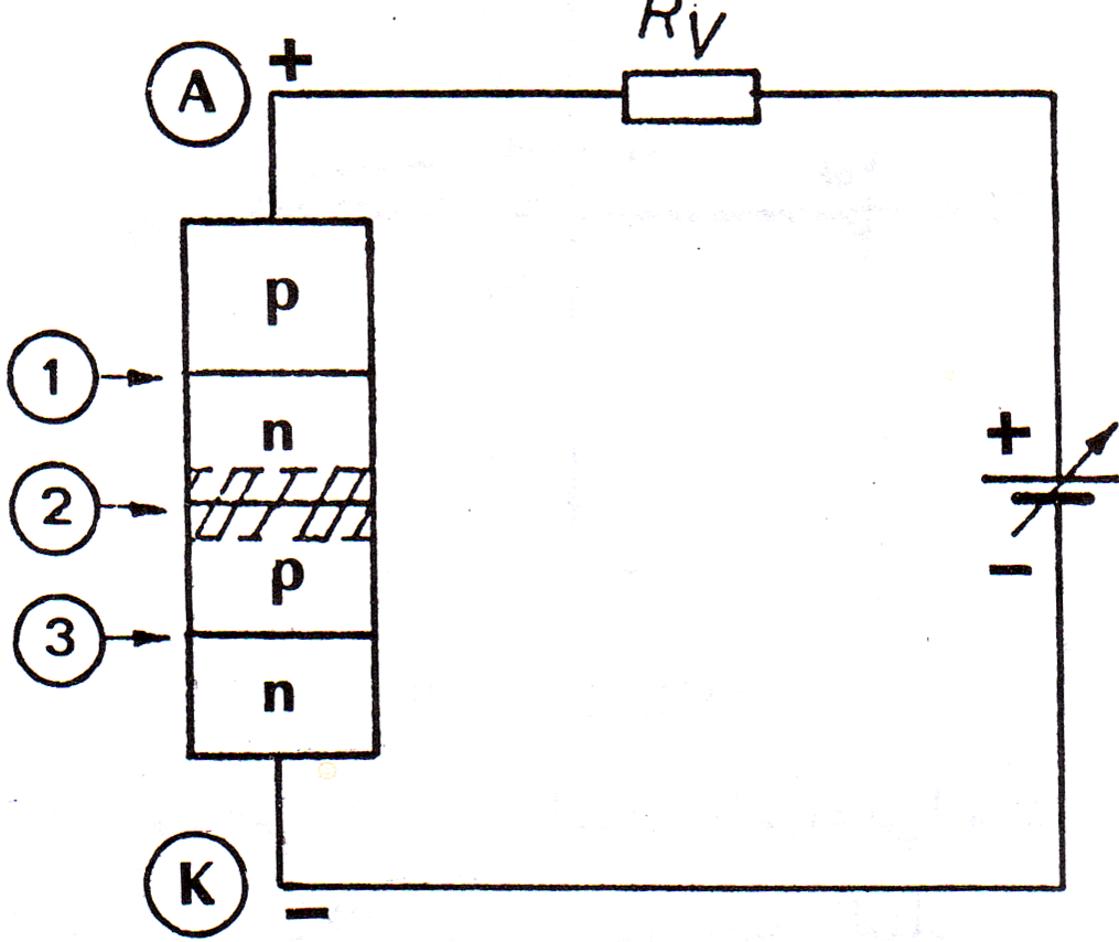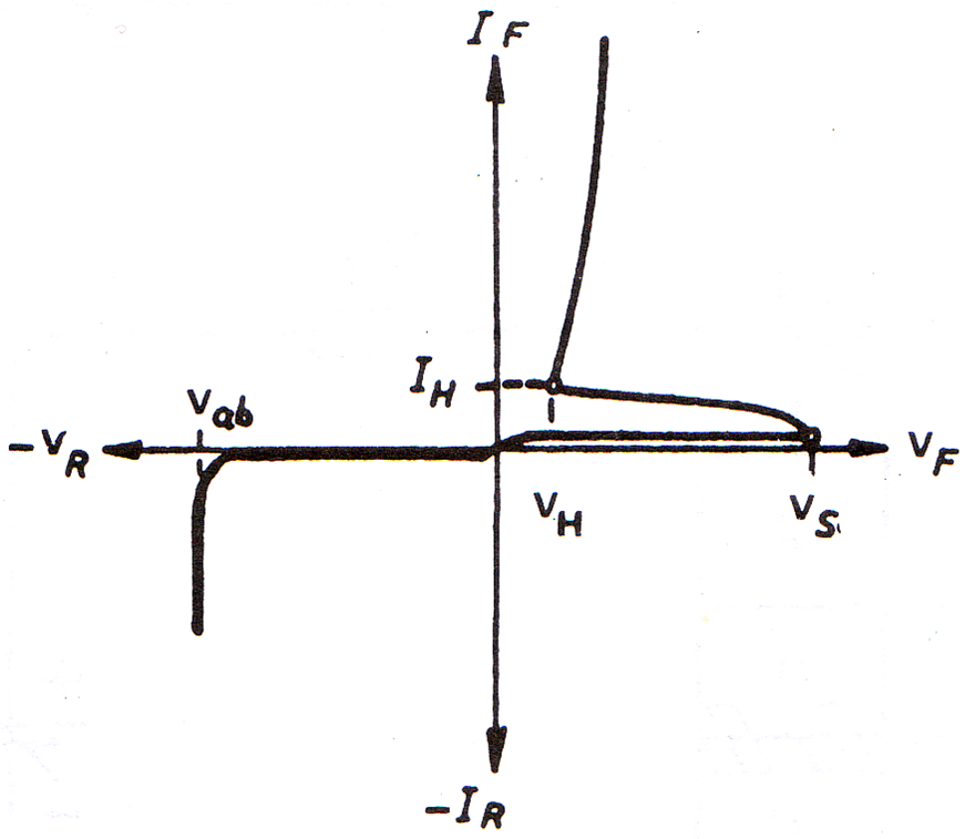 يكون الثنائيان عندها D1 و D3 موصولان أمامياً لذلك تزول منطقة الفصل بين الشرائح ، ويكون D2 محيز عكسياً ، ومع زيادة الكمون تزداد منطقة الفصل ، وعندما يصبح فرق الكمون بين طرفي الثنائي D2 مساوياً إلى كمون الانهيار Vs يفتح الثنائي ويسمح بمرور التيار من خلاله ، عندها ينخفض فرق الكمون بين طرفي الثنائي إلى القيمة VH ويمر فيه تيار IH.